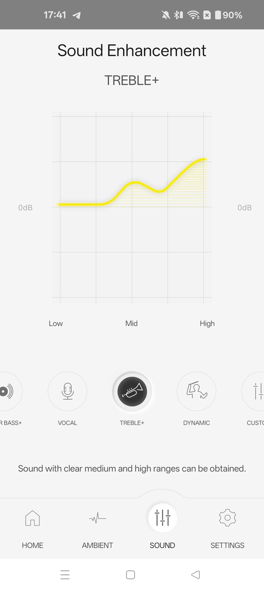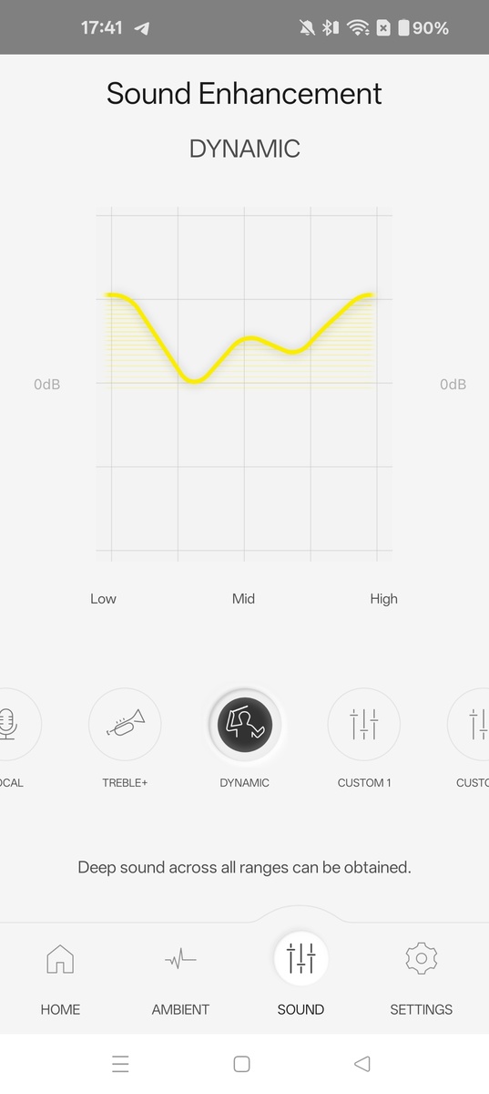 By default, the Technics EAH-AZ100 deliver moderate bass, accentuated highs, and a slight lack of mids. This is the equalizer’s default setting. The connection mode is LDAC codec with sound prioritization. Next, I will describe the sound in sound priority mode and with my EQ setting: a slight addition of bass, a slight addition of mids, and significantly boosted highs. The best preset, if you don’t want to copy my EQ, is Top h+ or Dynamic, but they sound worse than mine. I don’t recommend staying on the default either.