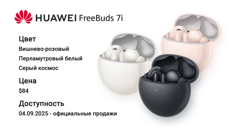 Компания Huawei выпустила новое поколение бюджетных TWS наушников — внутриканальные FreeBuds 7i. В сравнение с Bluetooth наушниками FreeBuds 6i новинка получила минимальные изменения: динамическое шумоподавление ANC 4.0 вместо 3.0, Bluetooth 5.4 вместо 5.3 и микрофон костной проводимости. Беспроводные наушники получили интеграцию с HarmonyOS: голосовой помощник, умные уведомления, пространственный звук и т.д. Остальные параметры не изменились.