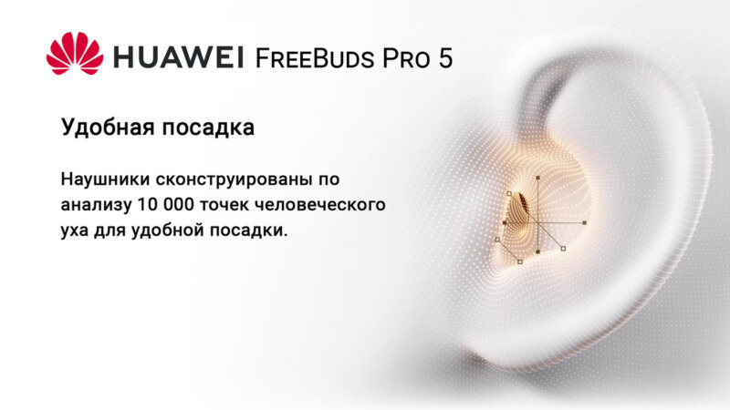 Для удобной посадки наушники HUAWEI FreeBuds Pro 5 сконструированы по анализу 10000 точек уха. Предыдущее поколение понравилось по посадке, уши не устают. Как и в наушниках-вкладышах Huawei Freebuds 6. Плюс в комплекте идут 4 пары амбушюр разного размера.