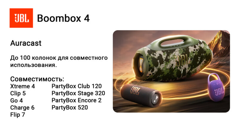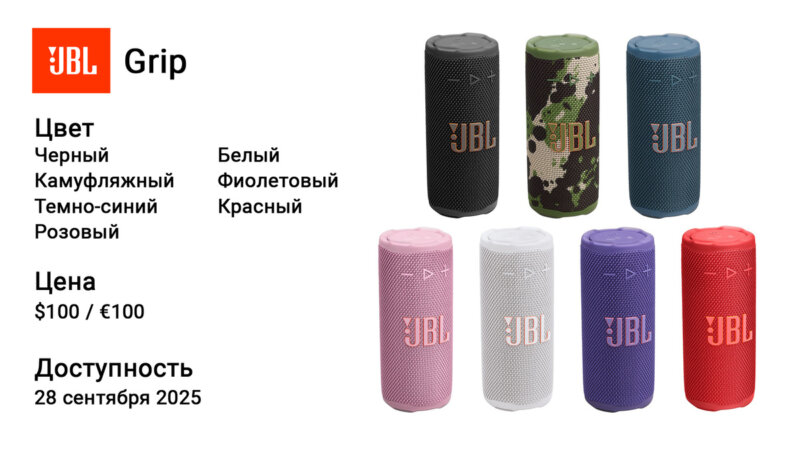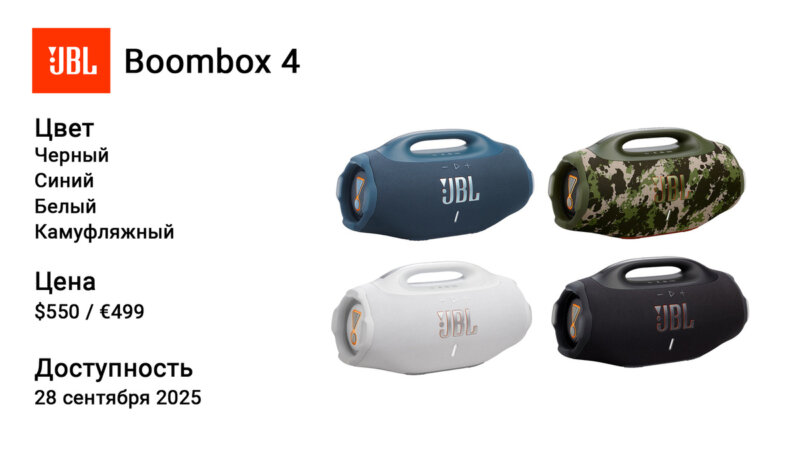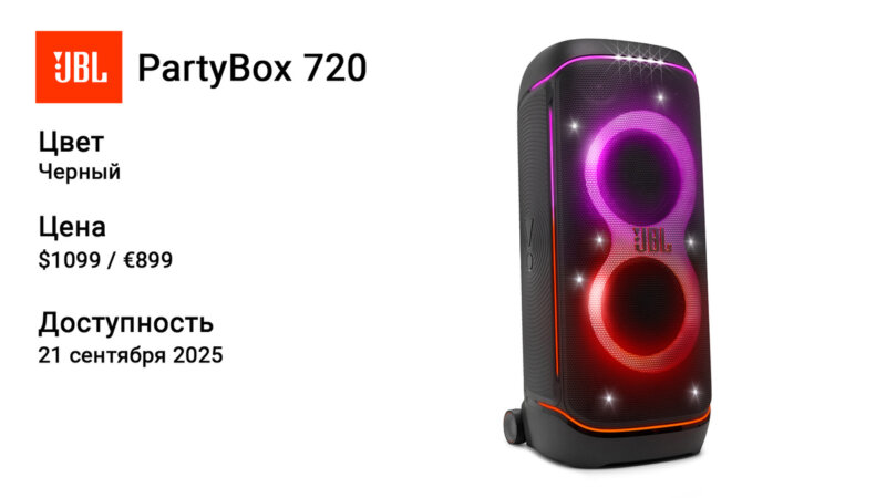 Компания JBL представила три портативные колонки: маленькую Grip, большую Boombox 4 и для вечеринок — PartyBox 720. Boombox 4 и PartyBox 720 — следующее поколение беспроводных колонок Boombox 3 и PartyBox 710, только со сменными аккумуляторами. А JBL Grip — новая серия, визуально похожа Flip, только с подсветкой, меньше и легче. Все новинки поступят в продажу в сентябре 2025.
