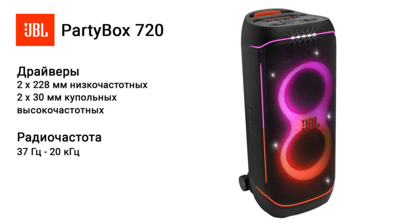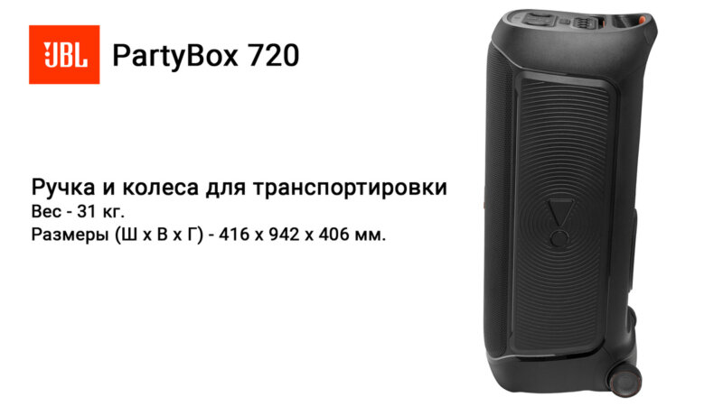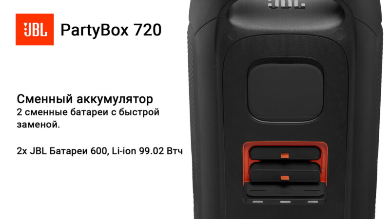 Огромная колонка JBL на колесах, с аккумулятором и настраиваемой в приложении подсветкой. В сравнение с PartyBox 710 новинка получила два сменных аккумулятора и может работать автономно, PartyBox 710 и вовсе работала только от сети. Вес колонки на 3 кг больше — 30.8 кг, а размер драйверов вырос с 203 до 229 мм.