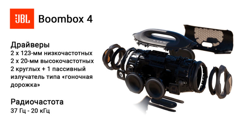 • Новая звуковая система. Колонка получила 2 НЧ и 2 ВЧ драйвера, а так же дополнительный пассивный излучатель на тыльной стороне. Напомню в Boombox 3 стоят 5 драйверов: 1х сабвуфер, 2 СЧ + 2 ВЧ. При этом суммарная мощность выросла до 210 Вт против 180 Вт при подключении к розетке. А при использовании аккумулятора 200 Вт против 136 Вт.