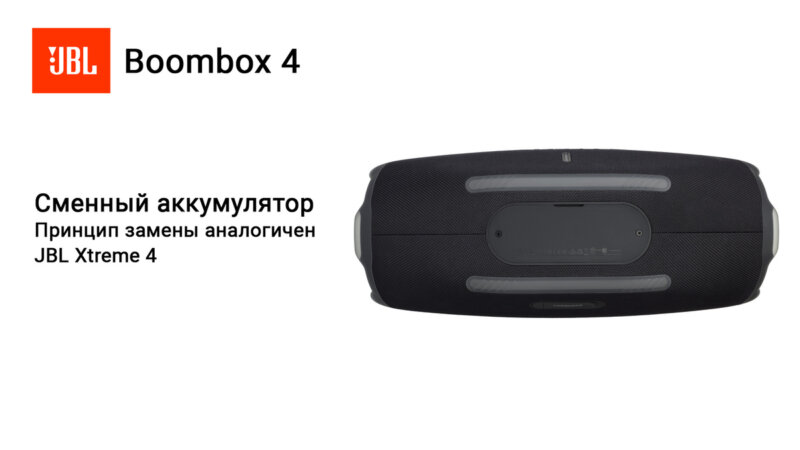 • Сменный аккумулятор. Теперь для замены аккумулятора не нужно разбирать колонку. Достаточно открутить 4 винта в основании. Принцип замены аналогичен JBL Xtreme 4. Что невероятно круто.