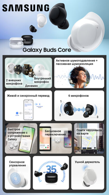 27 июня 2025 года компания Samsung представила новые TWS наушники — внутриканальные Galaxy Buds Core. Это новая версия Bluetooth наушников Galaxy Buds FE.