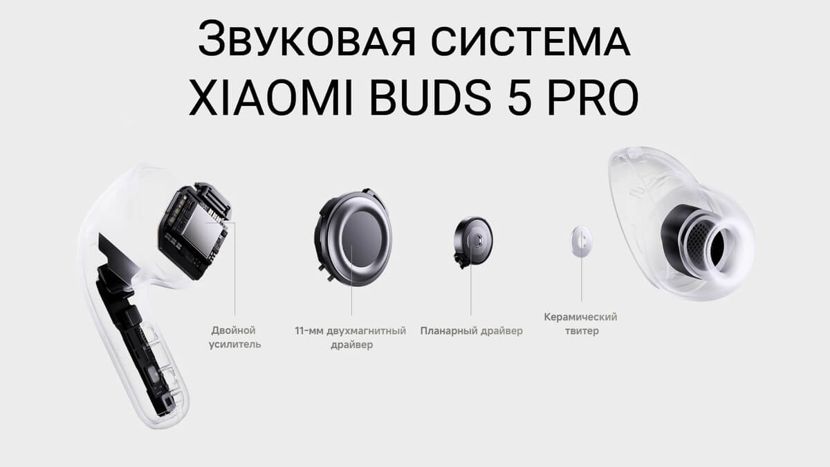 За звук внутриканальных наушников Xiaomi Buds 5 Pro отвечает двойной усилитель мощности и три драйвера. Причем оба усилителя отдельно управляют низкими и высокими частотами для снижения искажений. Звуковая система состоит из 11-мм динамического драйвера с двойным магнитом, как в Xiaomi Buds 4 Pro, а так же керамического твитера и планарного излучателя. Bluetooth наушники могут воспроизводить звук в частотном диапазоне 15 Гц — 50 кГц.
