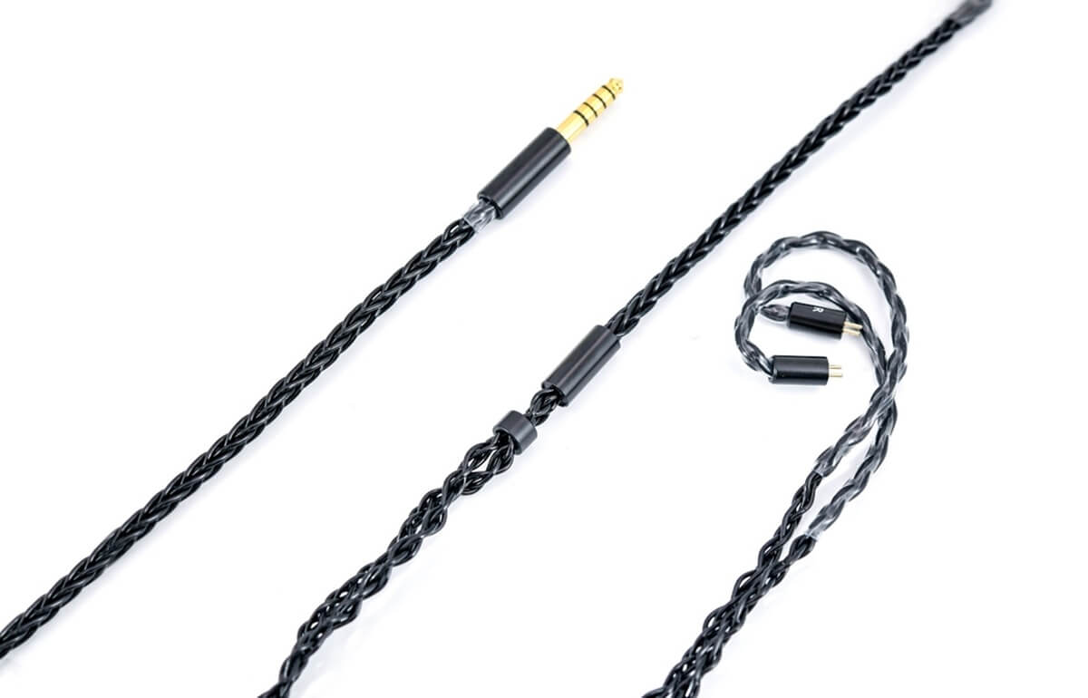 Кабель. Съёмный, выполнен из посеребрённой бескислородной меди (OFC) с армирующими волокнами арамидного типа для прочности и защиты от запутывания. Каждая из четырёх жил содержит по 30 проводников для снижения сопротивления и стабильной передачи сигнала.