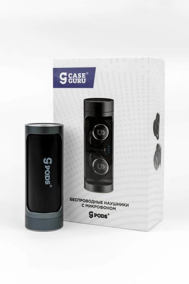 Кейс CaseGuru CGpods – один из козырей данной модели. Он не самой распространённой формы (цилиндр), довольно габаритный. Но при этом сделан из алюминия и матового пластика, что повышает износостойкость.