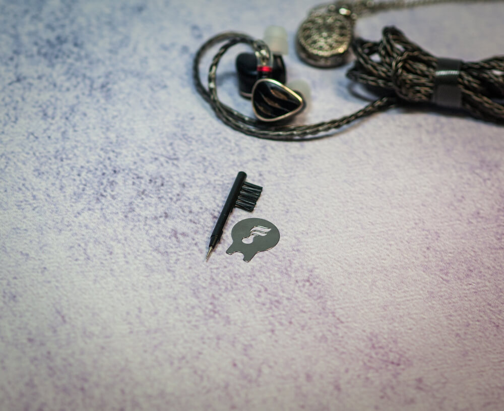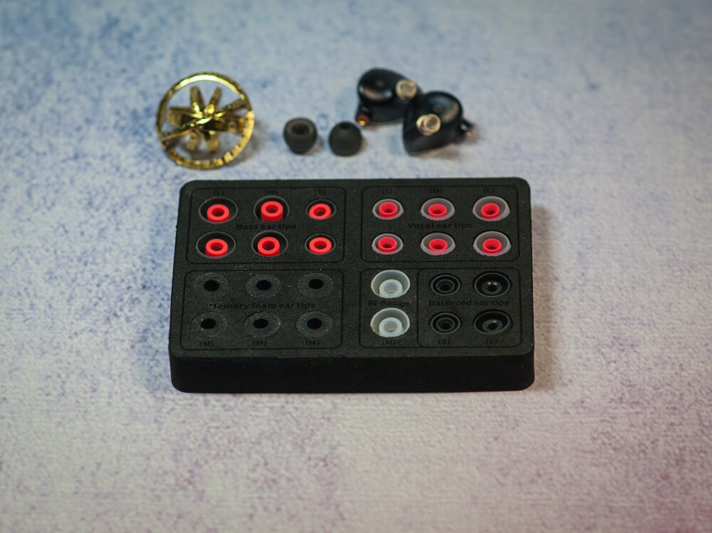 - Приятная комплектация. Много амбушюров с разным влиянием на звук, 3 штекера разного формата, качественный кейс и удобные инструменты для чистки и снятия наушников с кабеля.