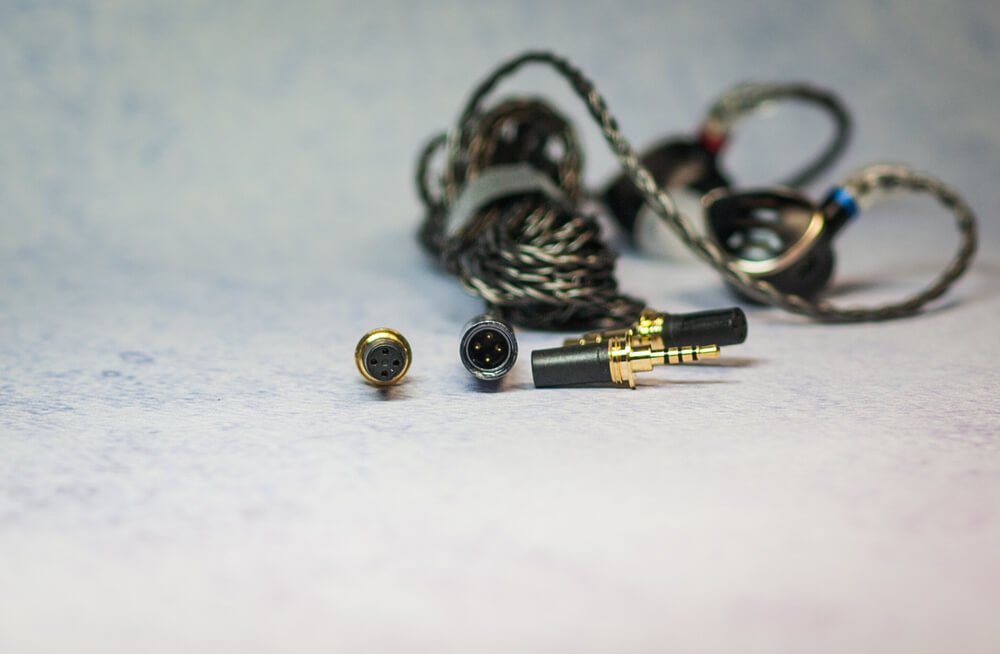 Сменные штекеры. Одно из преимуществ Fiio FH5s Pro, а точнее их комплектного кабеля, – это возможность замены штекера. Балансное подключение сейчас популярно, а производители никак не придут к одному стандарту. В некоторых плеерах используется интерфейс 2,5 мм, а в других – 4,4 мм. Хорошо иметь штекер на любой случай. Снять и надеть его довольно просто. Поворачиваем металлический корпус, там есть резьба. После того, как полностью скрутили его, аккуратно тянем штекер в сторону. Он подключается на 4 контакта-штырька. На внутренней стенке капсюля есть засечка, а на штекере бороздка: важно совместить их, подключая новый штекер.