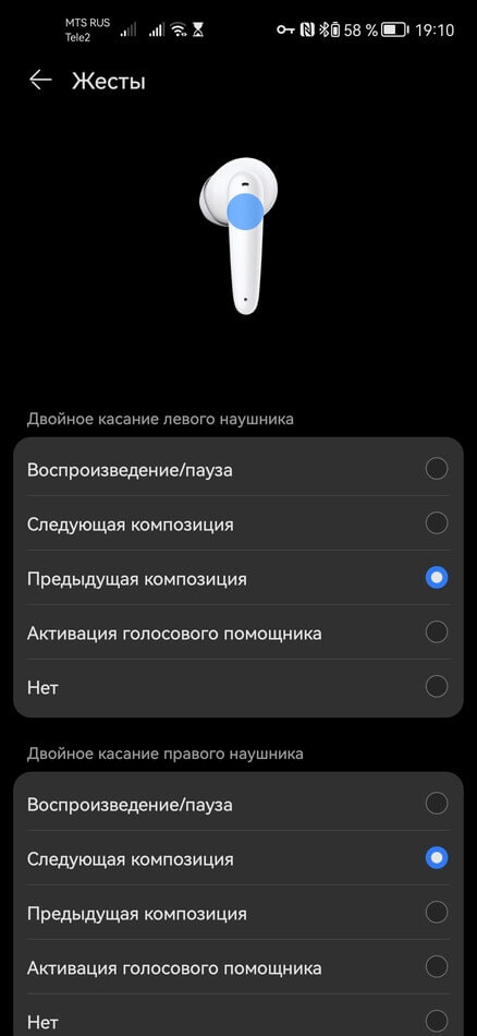 - Перенастройка управления. На правый и левый назначается отдельно или вместе: старт\пауза, следующий трек, предыдущий трек или голосовой помощник. Можно полностью отключить сенсорное управление.