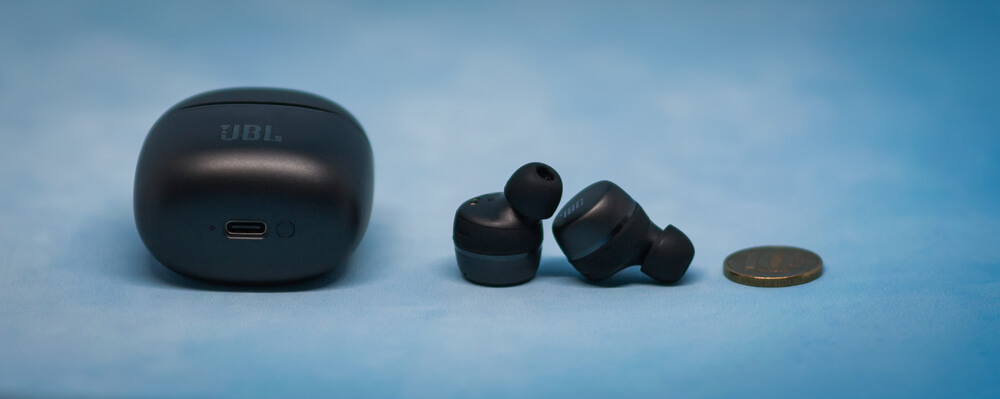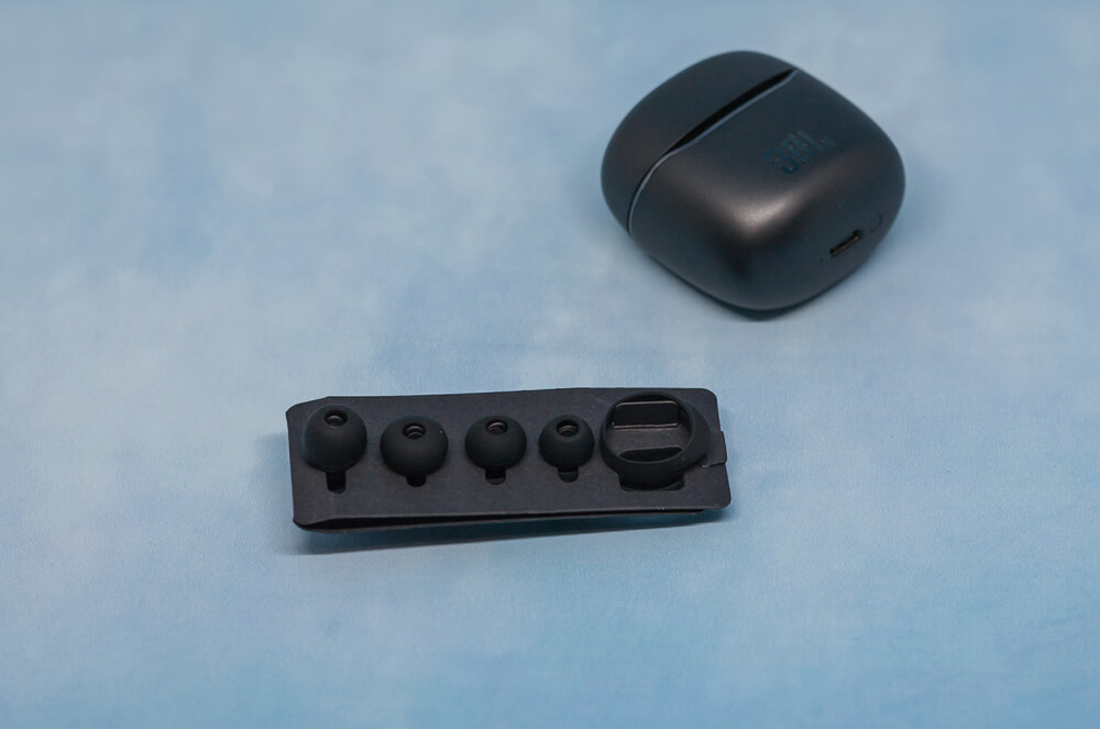 На наушниках уже надета ещё одна пара амбушюров и доп. креплений. Они выполнены их качественного силикона. Кабель, как всегда у TWS от JBL, короткий. Впрочем, в данном случае это не проблема. Аналогичный кабель с Type-C есть почти у всех, плюс модель поддерживает беспроводную зарядку.