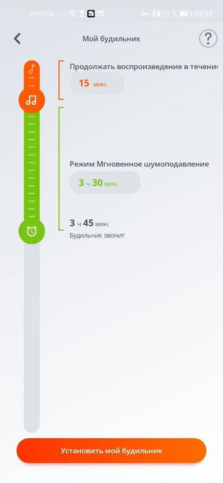 - Мой будильник. Интересная функция. Выставляем время, в течение которого будет играть музыка. И ещё один отрезок времени после, в течение которого наушники будут в режиме низкого энергопотребления с включённым шумоподавлением и выключенной музыкой. И после этих двух отрезков времени сработает будильник — плавно нарастающие звуковые сигналы. Идея в том, чтобы заснуть под музыку, спать в тишине и проснуться вовремя.