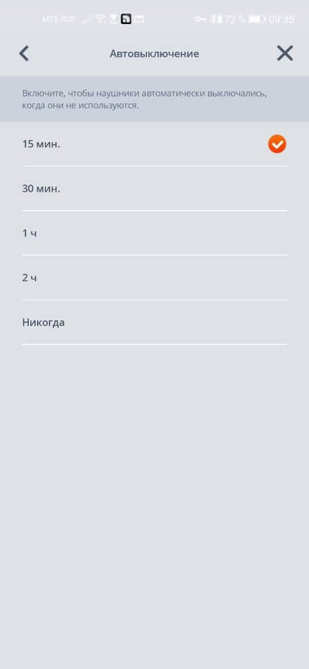 - Автоотключение. Можно выбрать период бездействия, после которого наушники выключатся. Или отключить этот режим вовсе.