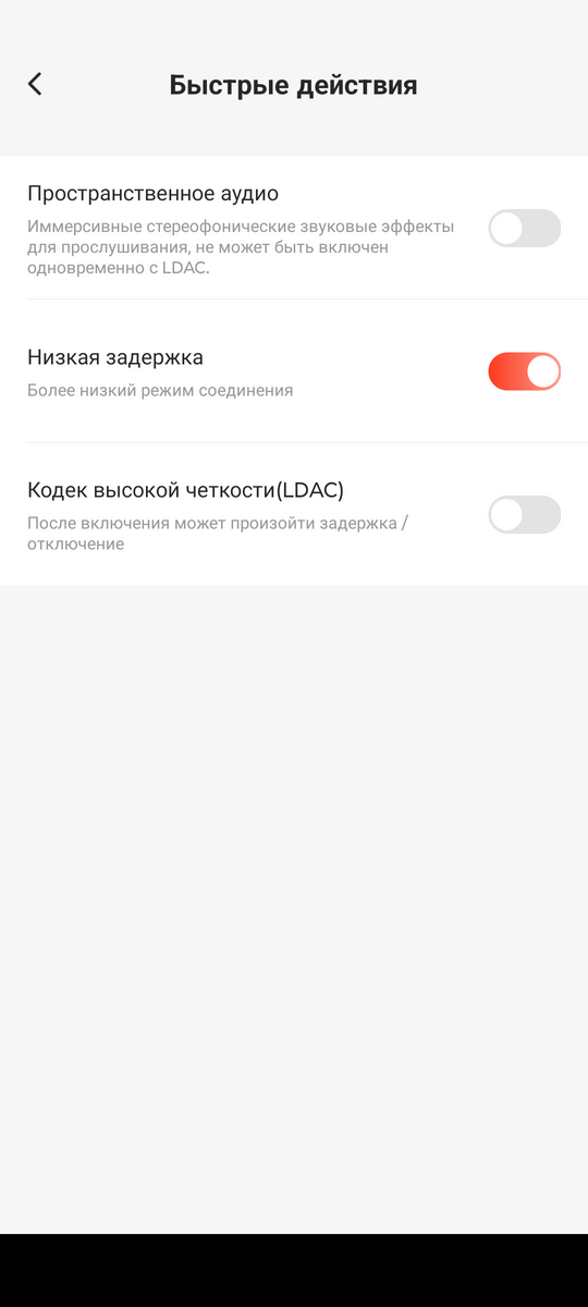- Быстрые действия. Пространственный звук — бесполезная функция. Низкая задержка — снижения задержки сигнала. Кодек высокой четкости — активация кодека LDAC.
