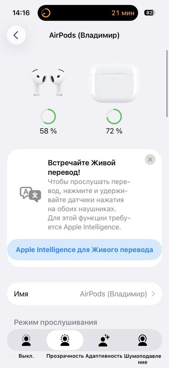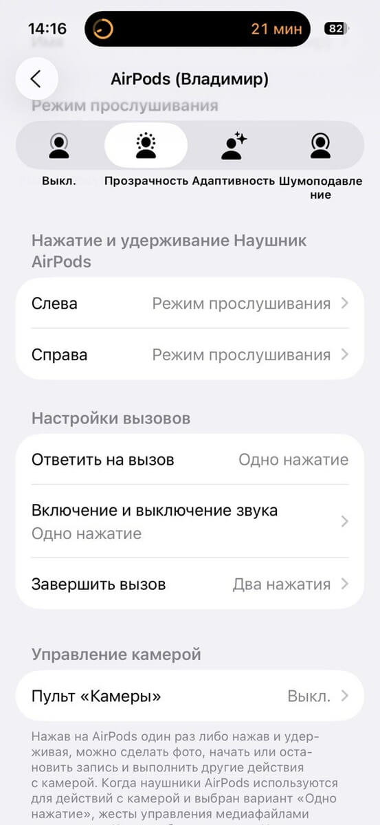 - Переключение между режимами активного шумоподавления, прозрачного режима и адаптивного звука: только на AirPods 4 (ANC) вы можете настроить любой из наушников AirPods на выполнение этого действия при нажатии и удерживании насадки. См. раздел Изменение настроек AirPods или AirPods Pro .