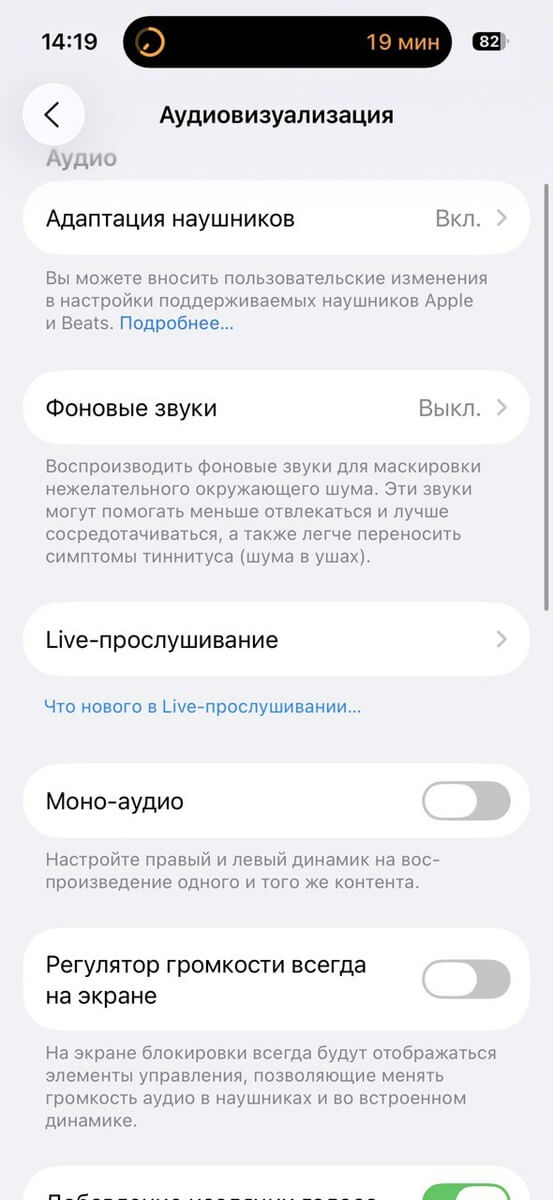 - Слуховые функции iOS: Live Listen, Headphone Accommodations.