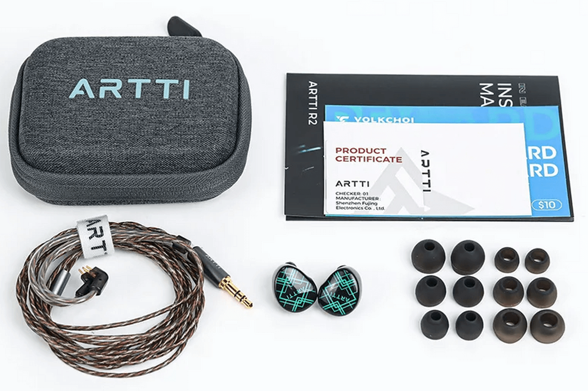 Комплектация — 7.5/10. В коробке с Artti R2 вы получаете сами внутриканальные наушники, съёмный OFC + SPC кабель длиной ~1,2 м с разъёмом 3,5 мм (опционально доступен вариант с 4,4 мм), защитный футляр для хранения, два комплекта сменных амбушюр для подбора посадки и стандартную документацию.