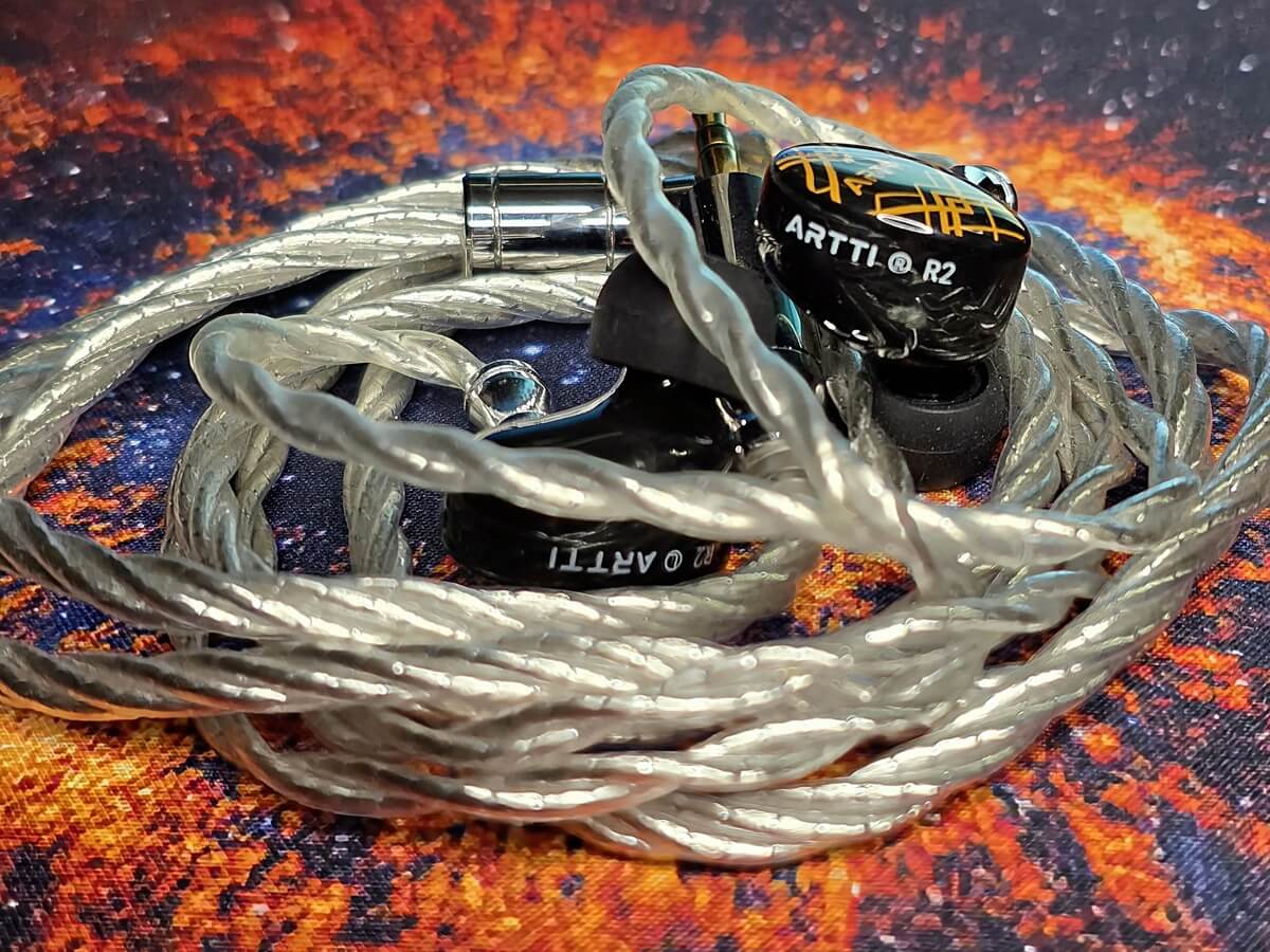 Кабель — 7/10. В комплекте с Artti R2 идёт качественный для своей цены 4-жильный серебряно-медный кабель с 2-pin разъёмами (0.78 мм), гибкий и не слишком шумный при трении, с плотным штекером на выбор 3.5/4.4 мм. Однако, чтобы получить тот самый звук, о котором я пишу выше (максимальную ясность, воздух и детализацию), стоит строго придерживаться «рецепта» Александра Чернова — перейти на более качественный кабель вроде ivipQ-34.