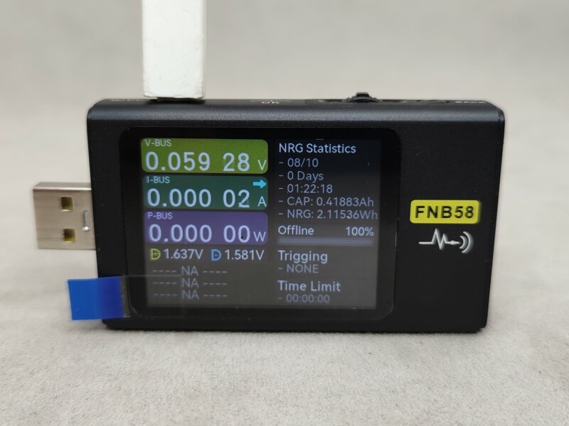 Время зарядки батареи по данным USB тестера Fnirsi FNB58 — 1 час. и 22 мин. Мощность зарядки 1.5 Вт. Емкость аккумулятора при 5V — 418 мАч или 2.11536 Втч.