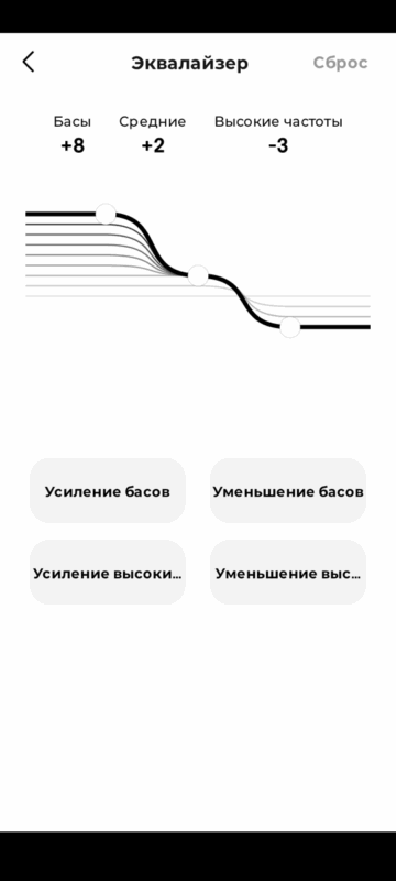 - EQ — настройка 3-х полостного эквалайзера и 4 готовых пресета: усиление басов уменьшение басов, усиление высоких частот, уменьшение высоких частот.