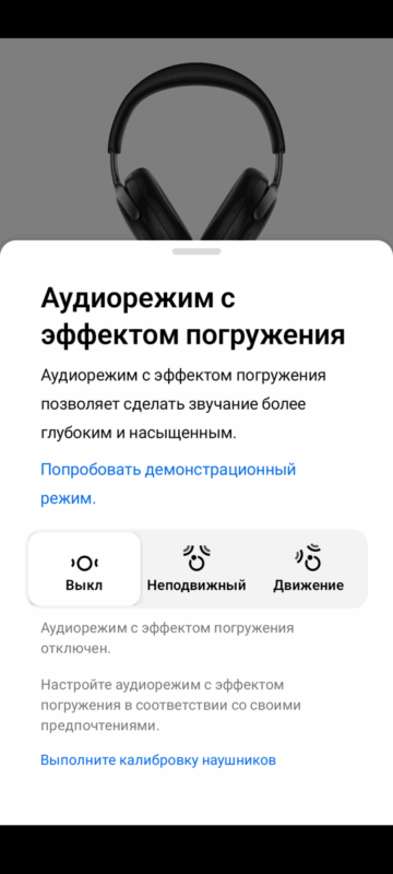- Аудиорежим с эффектом погружения — включение пространственного звучания с отслеживанием головы.