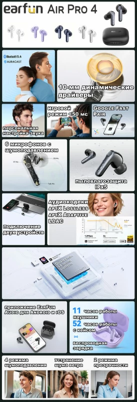Самое интересное в EarFun Air Pro 4, что обещает производитель, если очистить текст от рекламы: персонализированная настройка звука, поддержка аудиокодеков LDAC, aptX Lossless и aptX Adaptive. 6 микрофонов с программным шумоподавлением, 4 режима активного шумоподавления и 2 режима прозрачности, автономность — наушники до 11 часов и до 52 часов с кейсом. Есть беспроводная зарядка, Auracast и игровой режим до 50 мс. Но обо всем по порядку.
