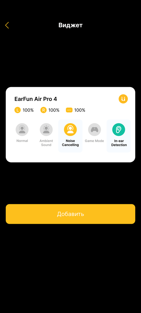 На вкладке Я можно добавить виджет в панель уведомлений. С виджета удобно переключать режимы работы: шумоподавление, прозрачность, игровой и т.д. Можно добавить такой же виджет на экран рабочего стола.