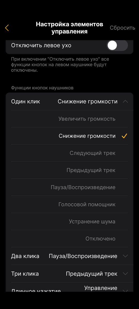 1. Откройте фирменное приложение EarFun Audio. 2. Выберите наушники на вкладке «Устройства». 3. Прокрутите страницу и выберите «настройка элементов управления». 4. Вверху экрана выберите наушник. Ниже выберите кнопку: один клик, два клика, три клика или длинное нажатие. 5. Выберите параметр из предложенных вариантов. 6. Вы можете полностью отключить управление оного или обоих наушников, а так же сбросить настройки управления до заводского.