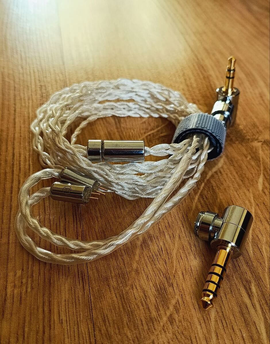 Кабель — 10/10. В комплекте один из лучших стоковых в сегменте до $200: мягкая 4-жильная литая оплётка из 6N OCC-меди с серебряным покрытием, практически нулевой микрофонный эффект, удобные металлические разделители и подбородочный слайдер, прозрачная изоляция не желтеет и не дубеет, а главное — надёжный модульный штекер 3.5/4.4 мм с чётким байонетом без люфта.