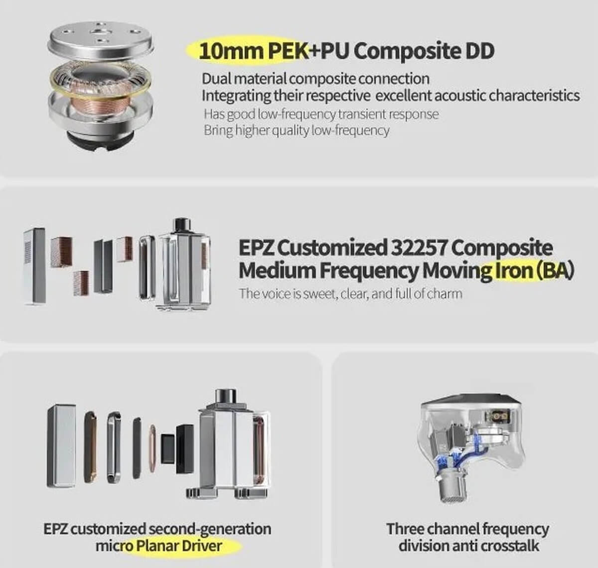 EPZ обещали настоящий прорыв: уникальная трибридная схема 1DD + 2BA + 2PLANAR. 10-мм композитный динамик выдаёт мощный и глубокий бас, два арматурных Knowles — чистую и детализированную середину, а пара микропланарных драйверов вытягивает верх до 40 кГц, добавляя искристый блеск и воздух. Всё сведено точным пассивным кроссовером и демпферами, а полуоткрытый корпус с вентиляцией полностью убирает резонансы и создаёт одну из самых широких сцен до $200. Производитель уверяет: пять драйверов трёх разных типов работают идеально слаженно. Правда ли это — узнаем прямо сейчас в обзоре. Что думаете об этой конфигурации? Пишите в комментариях!
