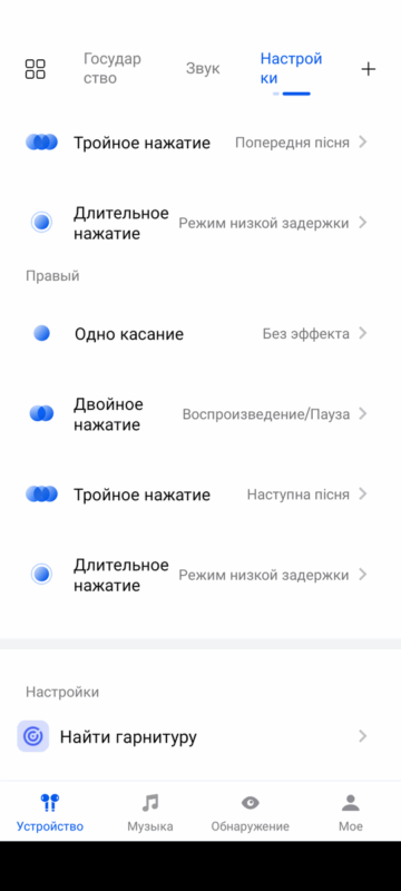 На вкладке «настройки» можно найти наушники — поиск на карте не работает, только по звуку. Можно обновить прошивку и посмотреть информацию о наушниках.