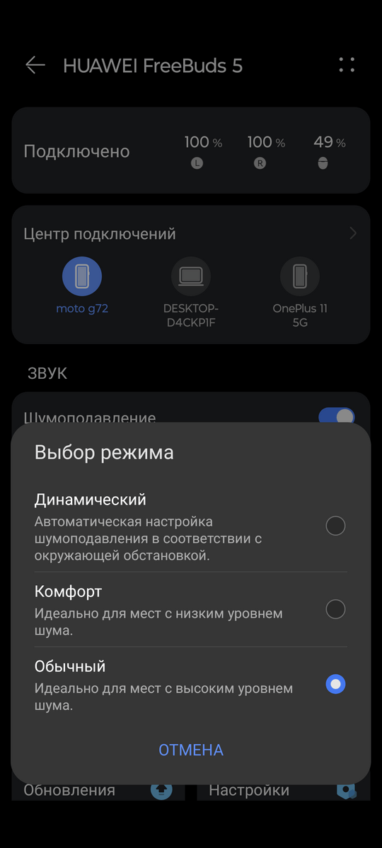 Шумоподавление — 3 режима работы: обычный — для высокого шума, комфорт — для мест с низким шумом, динамический — автоматическая настройка с учетом окружающего шума.