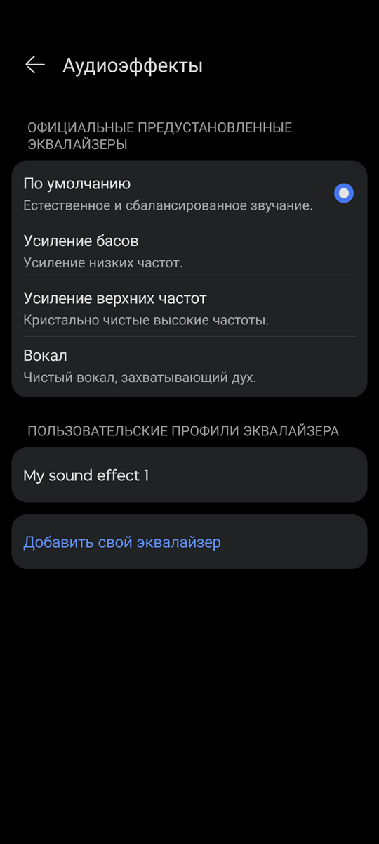 Аудиоэффекты — настройка эквалайзера. Всего доступно 4 готовых пресетов, включая стандартный пресет. Можно настроить 10-полосный эквалайзер вручную по нажатию на кнопку «+».