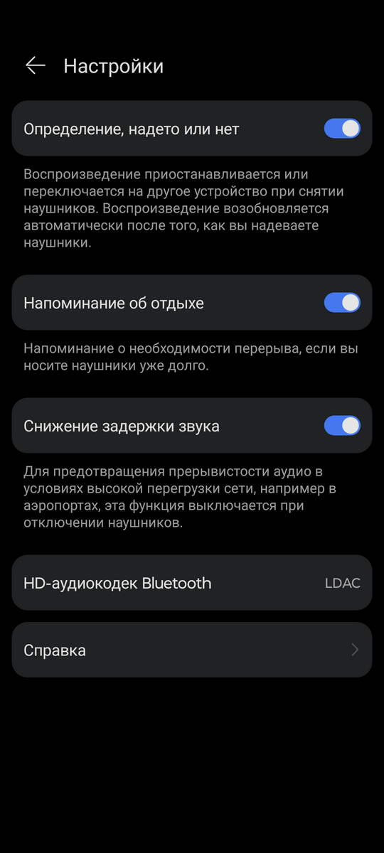 - Настройки — справка по управлению наушниками и разные небольшие опции: пауза при снятии наушников, напоминание перерыва при долгом использовании, снижение задержки звука — игровой режим, звуковой сигнал зарядки кейса.