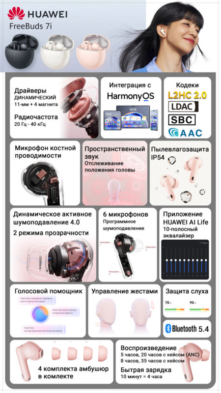 - Дополнительно: динамический эквалайзер, шумоподавление при разговоре, костная проводимость, инфракрасный датчик, холл-датчик, гироскоп, акселерометр, датчик касания, автоматическое сопряжение при открытии кейса (с Huawei EMUI 10.1+), одновременное подключение к двум устройствам, многоточечное подключение (с Huawei HarmonyOS 3.0+)