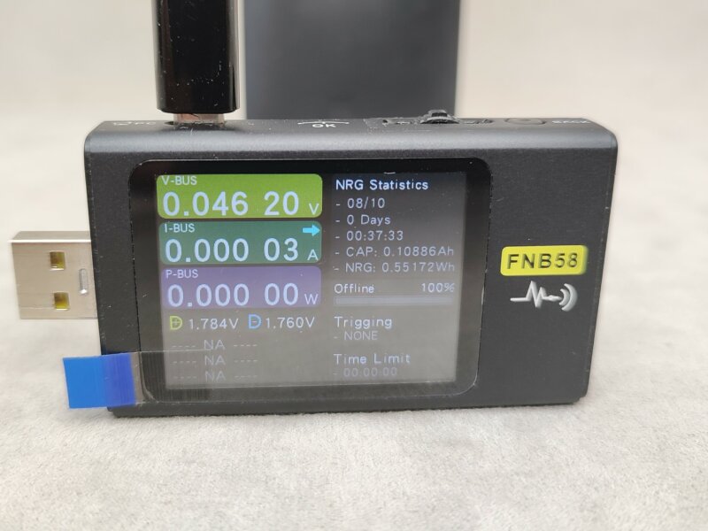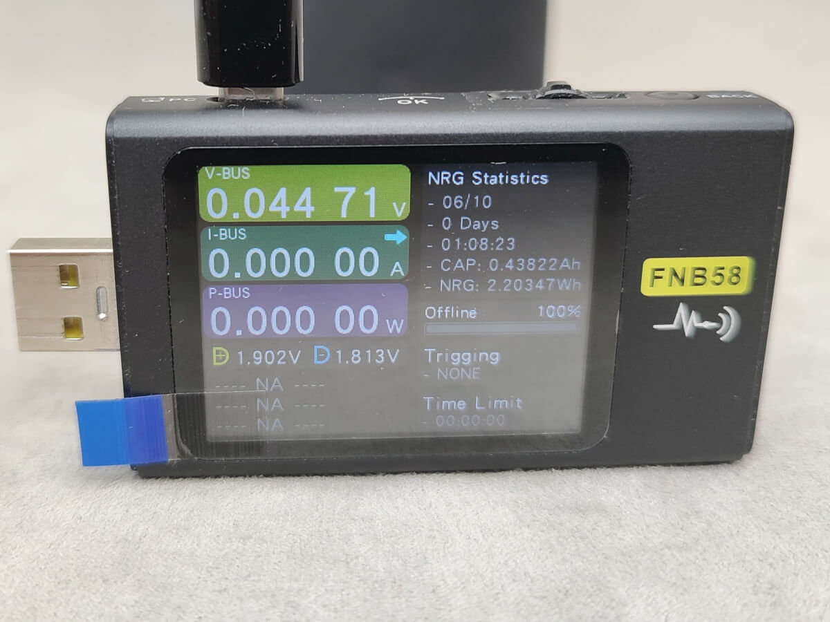 Время зарядки батареи по данным USB тестера Fnirsi FNB58 — 68 мин. Емкость аккумулятора при 5V — 438 мАч или 2.2 Втч. Батареи кейса хватает на 3 полные зарядки наушников.