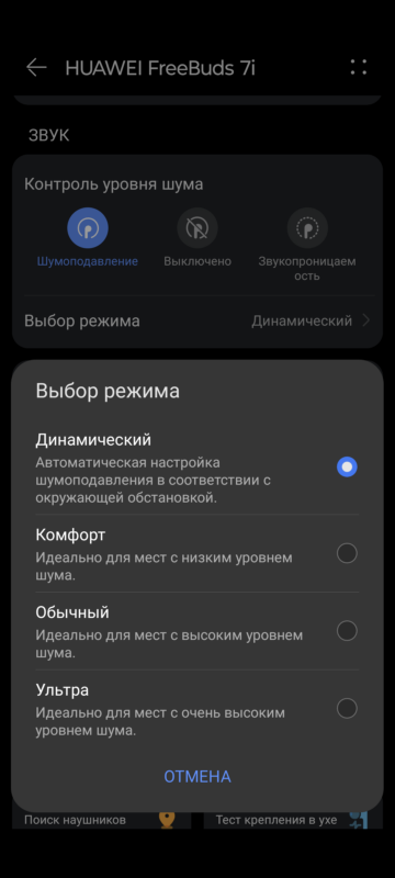 Контроль шума — выбор режима прозрачности и шумоподавления.