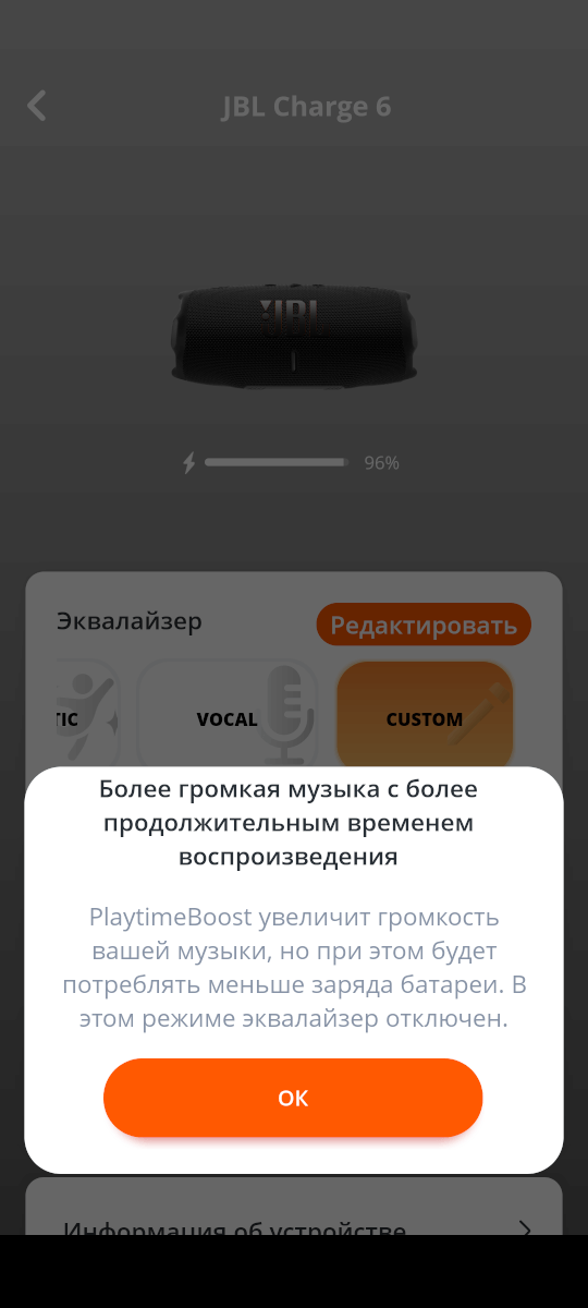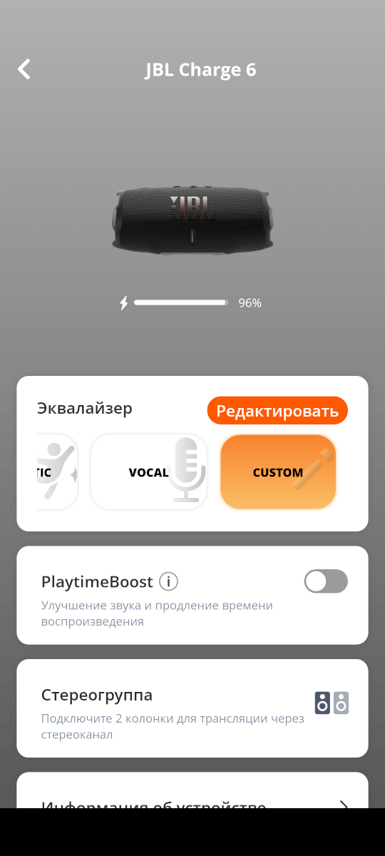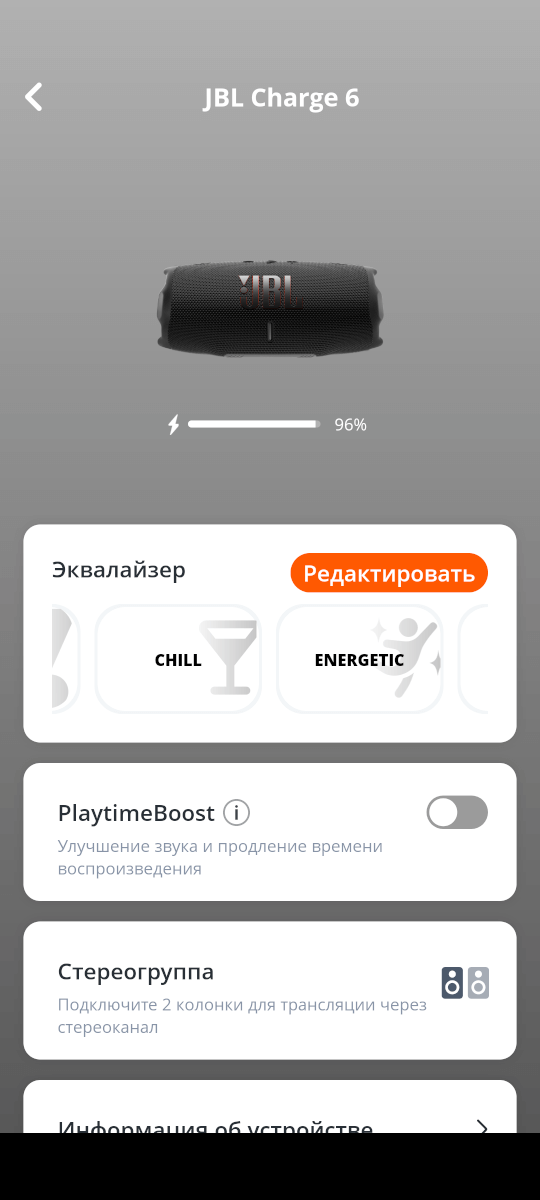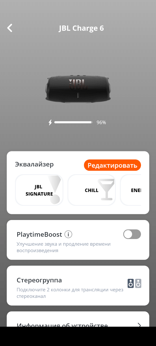 Приложение 9/10: JBL Portable вы можете скачать для Android и для iOS. В приложении доступен примерный заряд батареи, в настройках Bluetooth данных о заряде нет. Глобальный 7-полосный эквалайзер, 4 готовых пресета, создание стереопары с другой колонкой JBL Charge 6. Функция PlaytimeBoost для увеличения автономности. -1 балл — мало полезных функций.