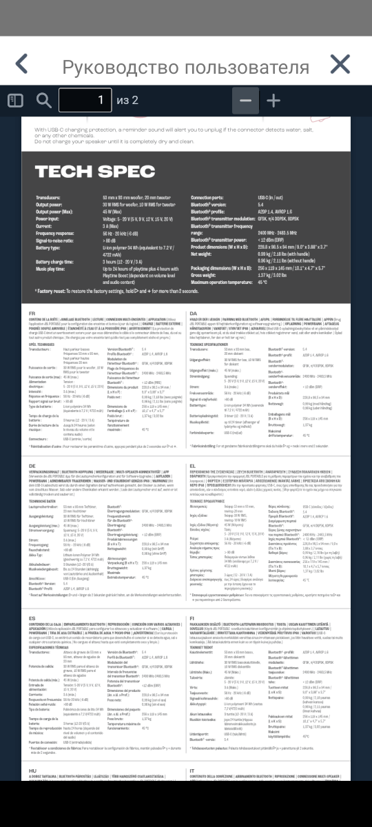Автономность — замеряется. Производителем заявлены 24 часа работы или 28 часов с функцией Playtime Boost без точных параметров лабораторных измерений. Максимальная мощность зарядки — 60 Вт, а 10 минут зарядки дают 2.5 часа воспроизведения. В режиме PowerBank колонка может выдавать до 45 Вт мощности. Сейчас я тестирую время работы колонки и добавлю информацию об автономности до 20.04.2025.