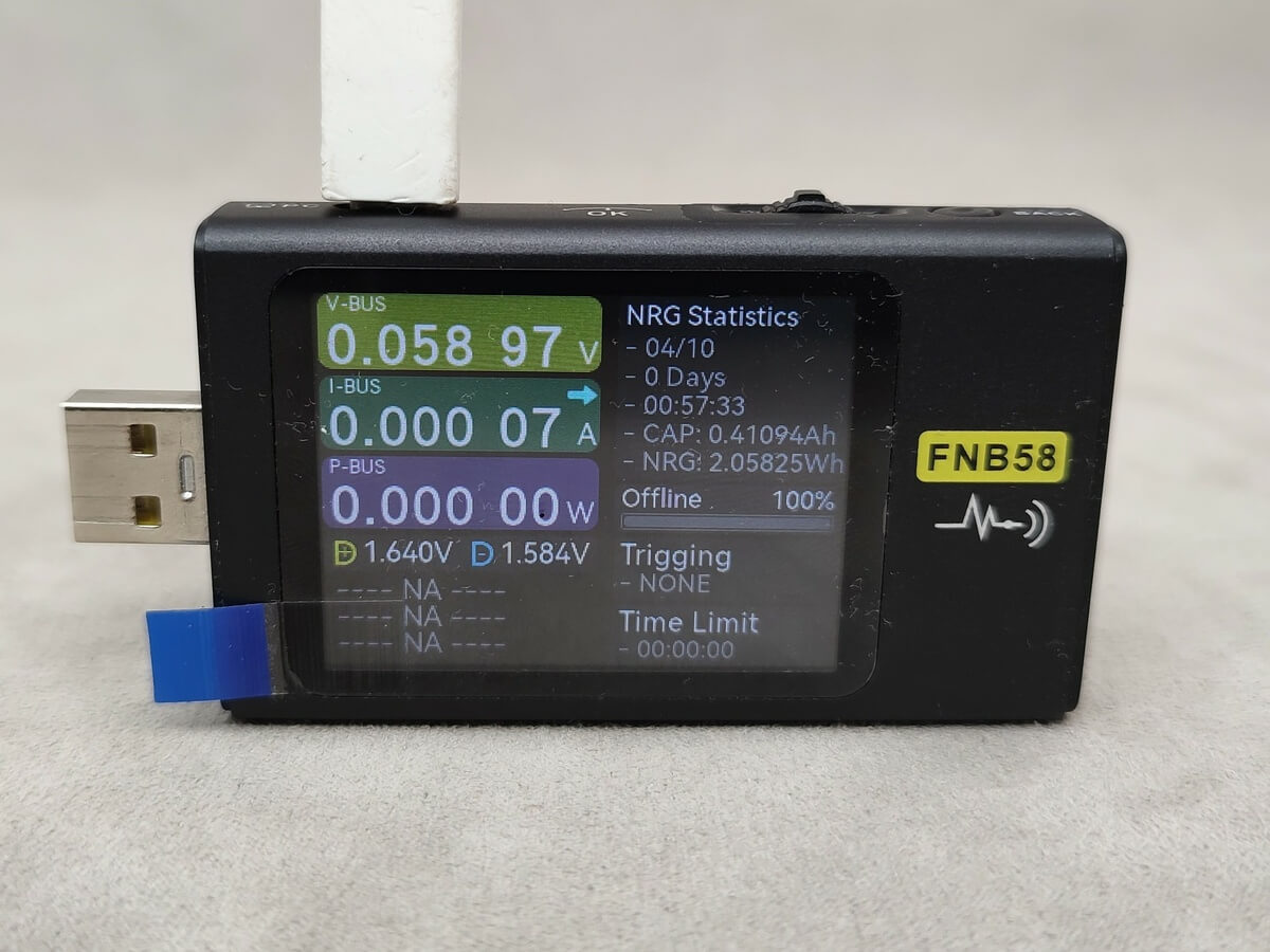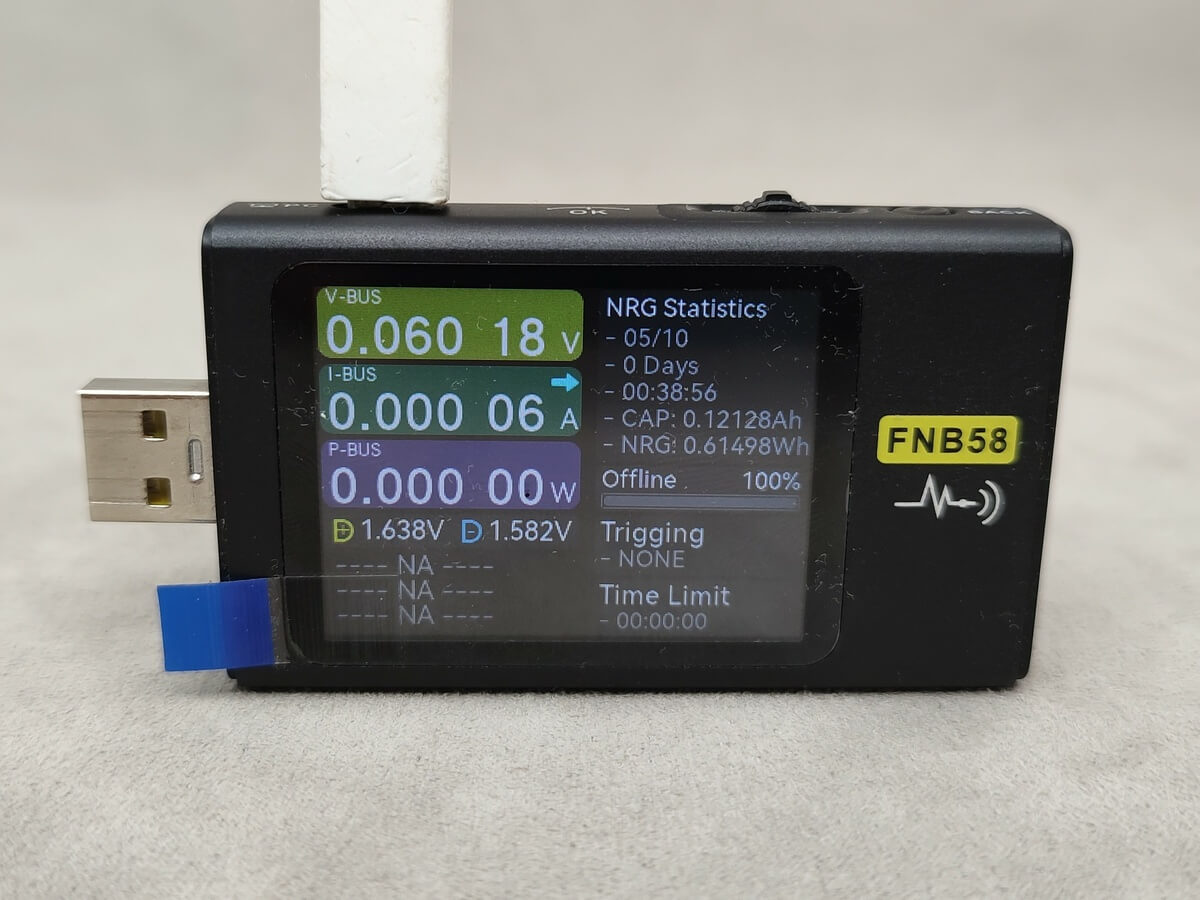 Время зарядки батареи по данным USB тестера Fnirsi FNB58 — 57 минут. Батареи кейса хватает на 2 полные зарядки и примерно ещё на половину. Емкость аккумулятора при 5V — 410 мАч или 2.05825 Втч. Наушники заряжаются в кейсе за 39 минут. Емкость батареи в двух наушниках примерно 121 мАч или 0.61498 Втч.