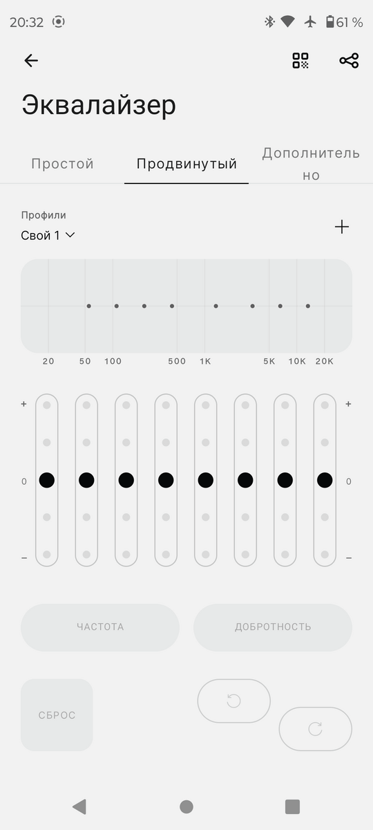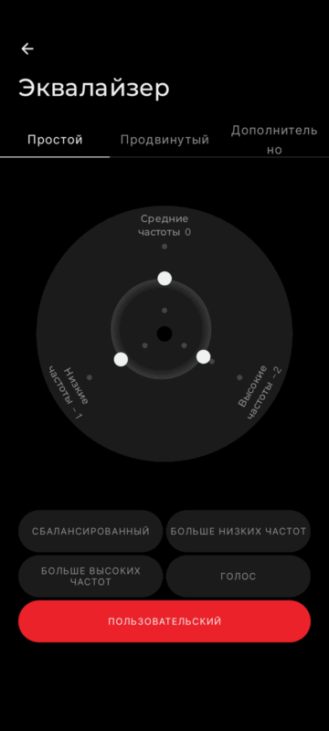 Эквалайзер. Есть 2 эквалайзера: простой и продвинутый. Простой на 3 полосы и 4 готовых пресета. Продвинутый на 8 полос с настройкой частоты и добротности. Дополнительно можно загрузить готовый пресет соощества. При желании можно отправить свой пресет для добавления в библиотеку сообщества. Готовые пресеты сохраняются внутри приложения.
