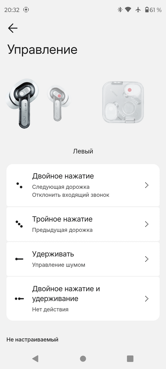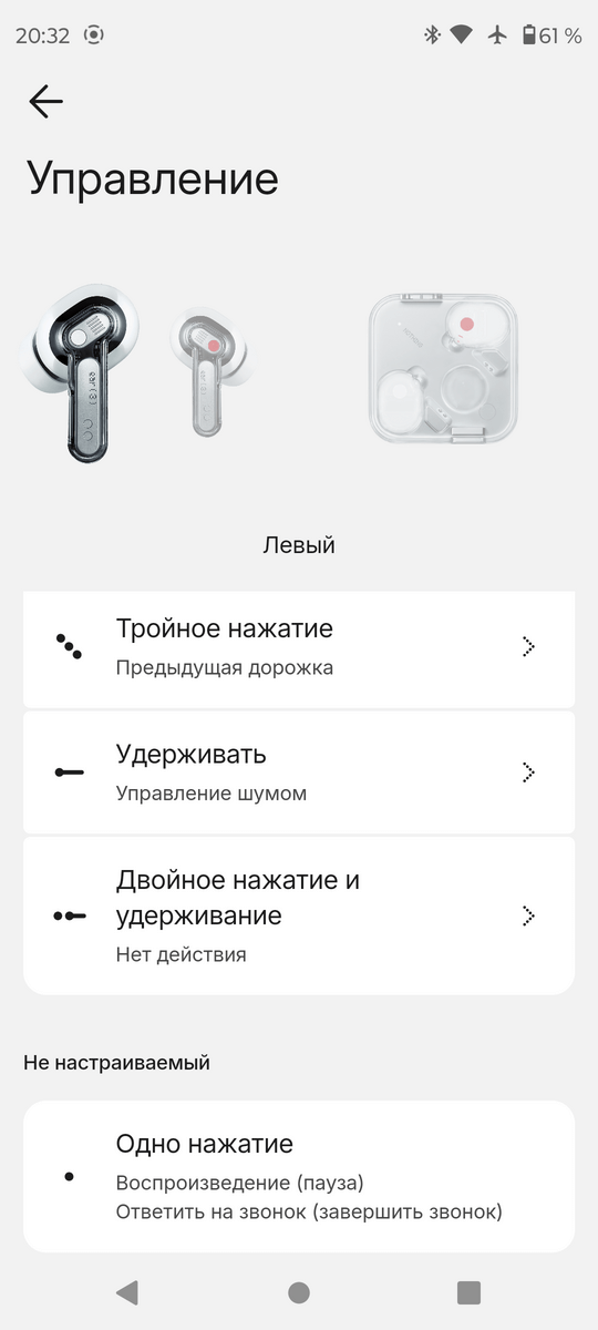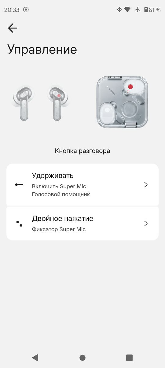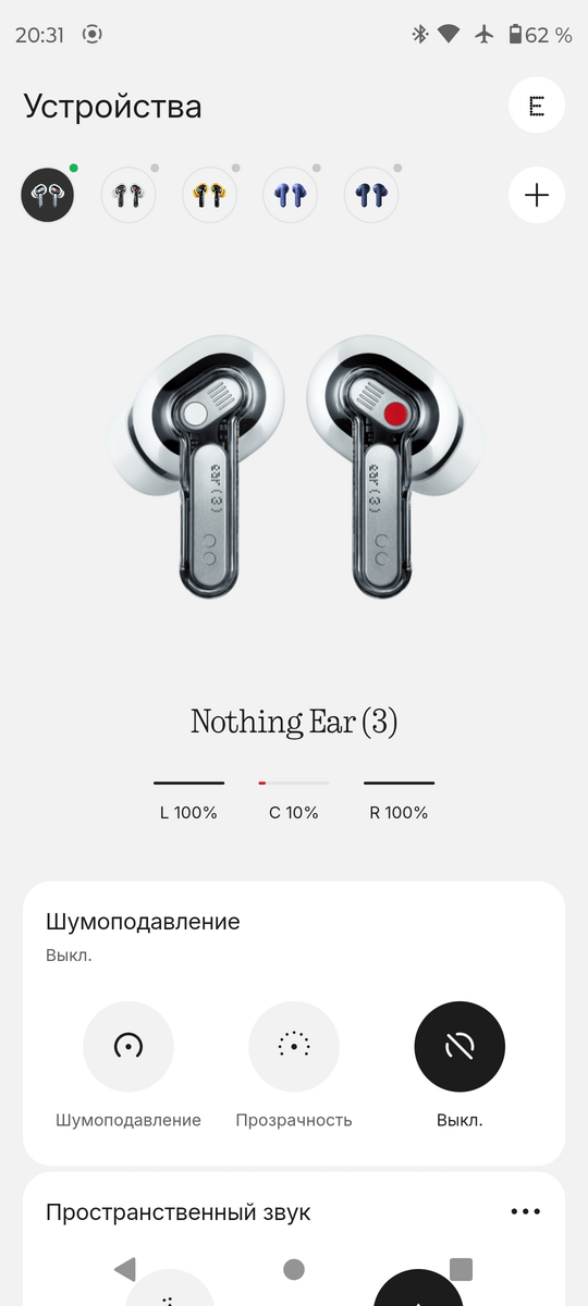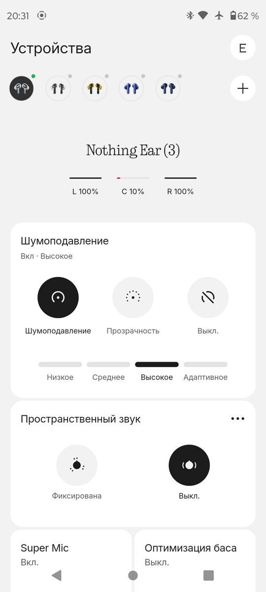 Все основные функции собраны на главном экране. В самом верху отображается заряд батареи наушников. Заряд батареи кейса только когда наушники в кейсе.