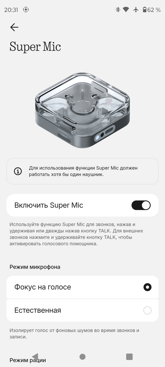 Супермикрофон. Есть 2 режима: супермикрофон и режим рации.