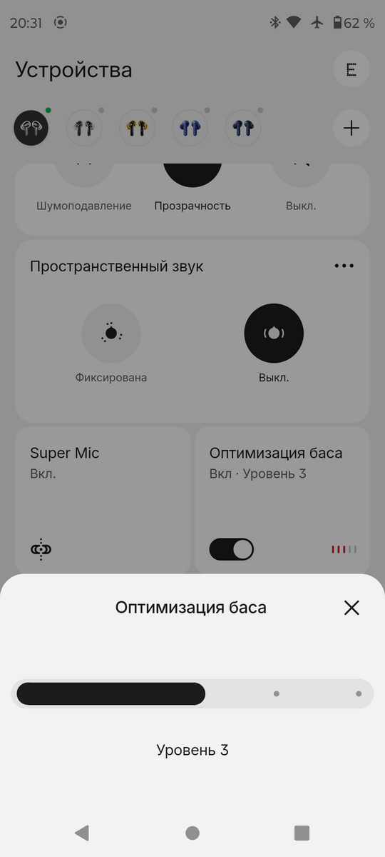 Шумоподавление. Выбор режима прозрачности и шумоподавления. Для шумоподавления доступно 3 уровня и 1 адаптивный.