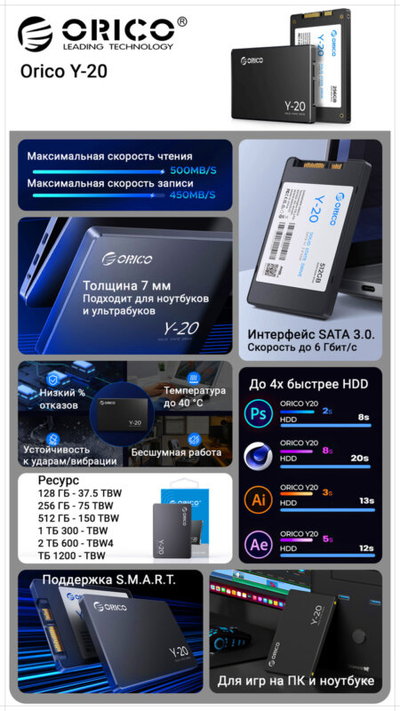 Я могу рекомендовать Orico Y-20 как недорогое временное хранилище. Скорость записи и чтения соответствуют. Ресурс как в эталоне Samsung 870 Evo. А в серии есть накопители до 4 ТБ. SSD накопитель комфортно использовать как внешний USB накопитель. Поэтому Orico Y-20 отлично подойдет для воспроизведения тяжелого видео, игр и приложений.