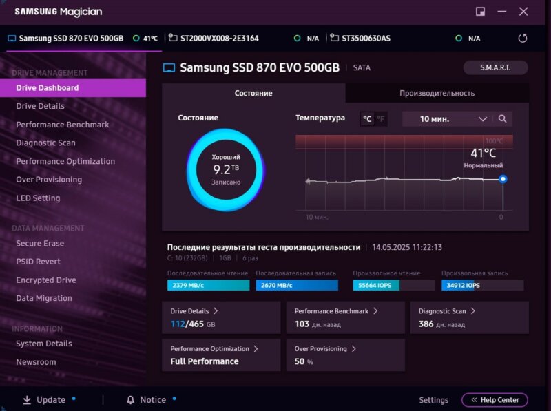 Заявленная производителем скорость линейного чтения и записи — 500 и 450 МБ/с. В бенчмарках с внешним подключением максимальная скорость чтения и записи — до 460 и 450 МБ/с соответственно. С внутренним подключением по Sata 3 максимальная скорость — до 550 и 520 МБ/с.