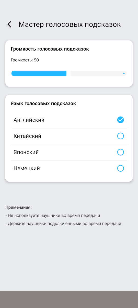 - Голосовое оповещение — выбор громкости оповещения в наушниках и языка.