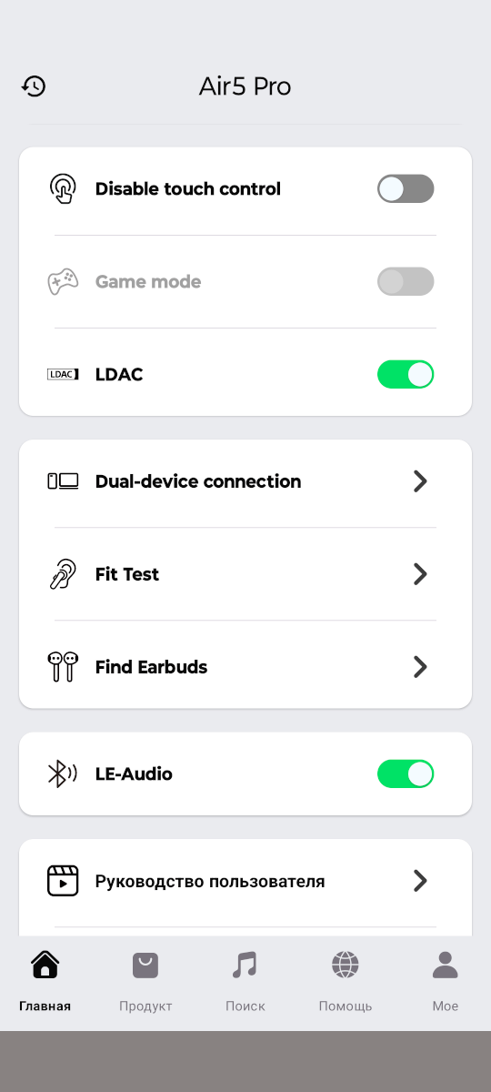 Приложение при каждом входе требует повторно выбрать наушники с 5-7 сек. задержкой подключения. А при каждом выходе из подменю — возвращает в начало списка. Хорошая локализация, правда местами есть слова без перевода. Не работает меню эквалайзер и поиск наушников.
