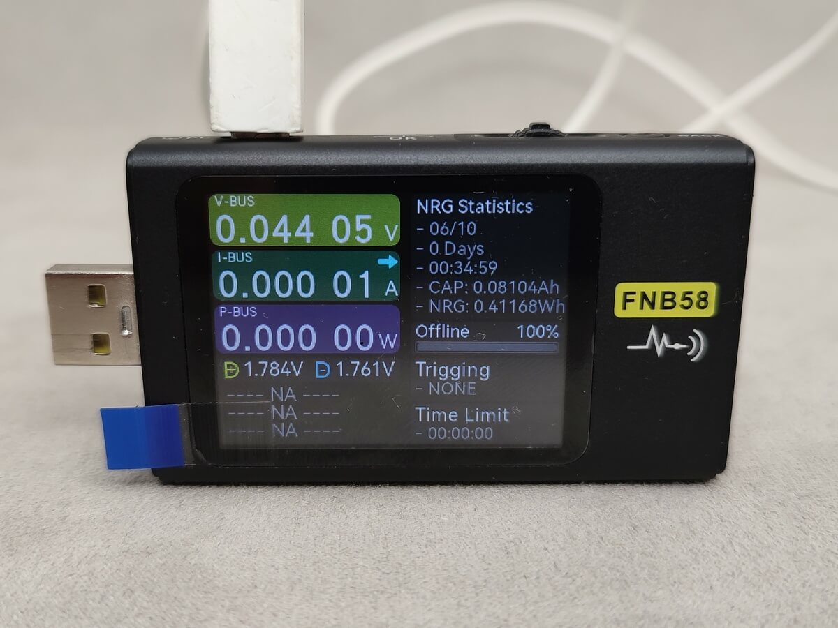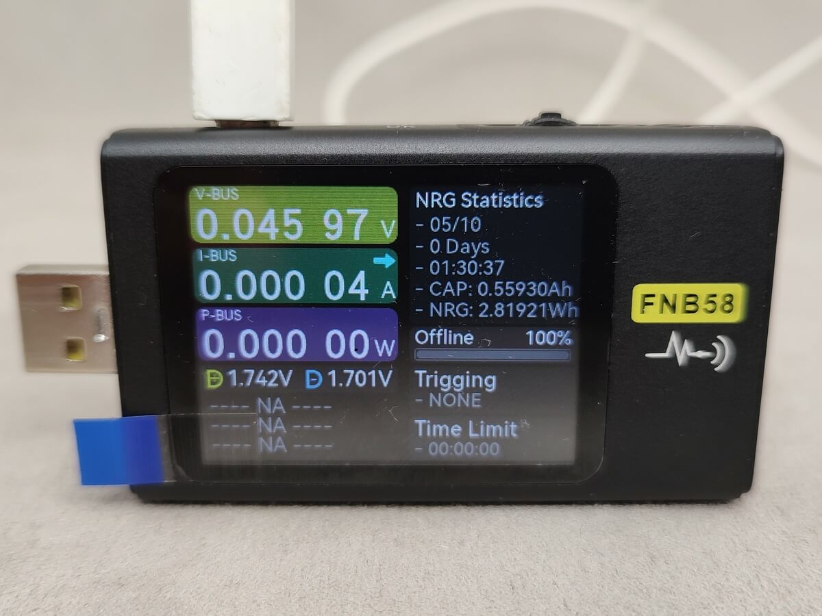 Батареи кейса хватает на 5 полных зарядок, плюс остаток 3 часа по кодеку SBC. Время зарядки батареи по данным USB тестера Fnirsi FNB58 — 90 минут. Емкость аккумулятора при 5V — 559 мАч или 2.81 Втч.