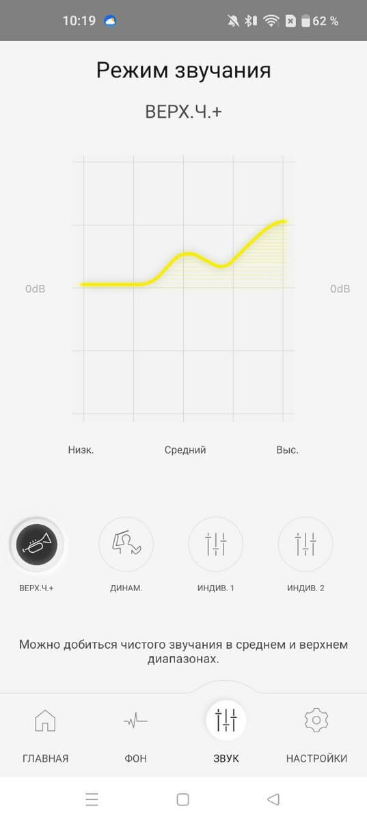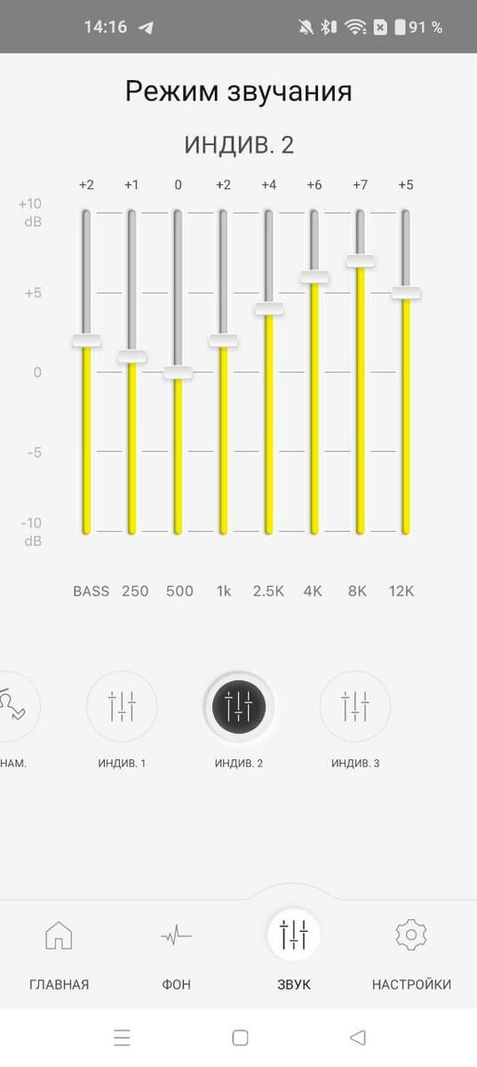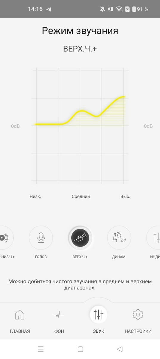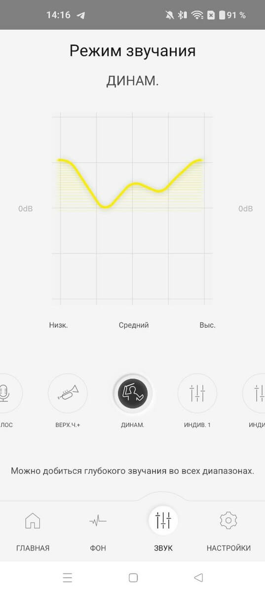 По умолчанию Technics EAH-AZ100 выдают умеренный бас, акцентированные высокие и небольшой недостаток середины. Это эквалайзер с дефолтной настройкой. Режим соединения — приоритет звучания по кодеку LDAC. Далее я буду описывать звучание в режиме «приоритет звучания» и со своей настройкой эквалайзера, небольшое добавление низа, небольшое — средних и значительное высоких. Лучший пресет, если вам не охота копировать мой эквалайзер, это «Верх ч+» или «Динам», но они звучат хуже, чем мой. И на дефолтном не рекомендую оставаться.